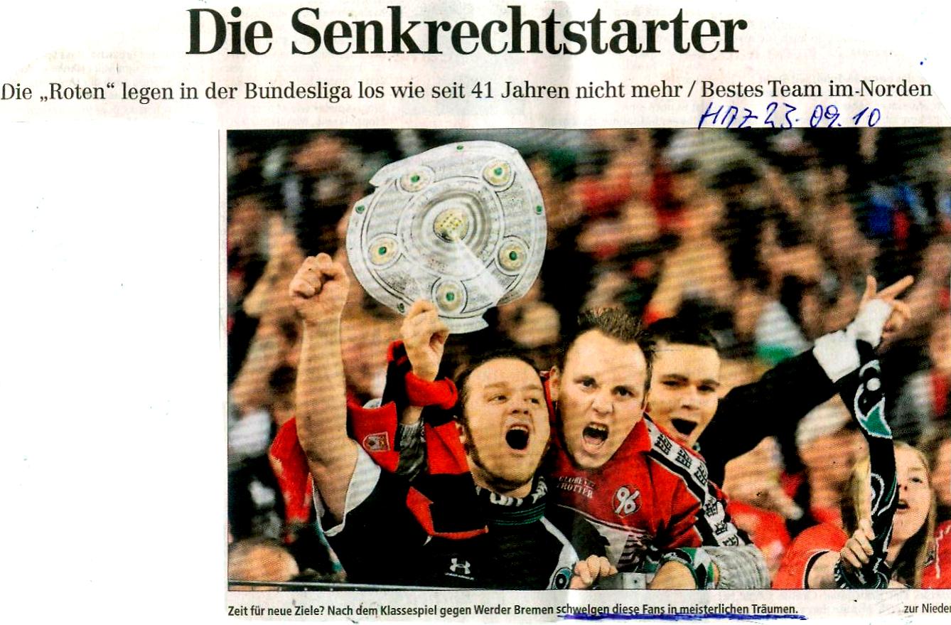 Ebenfalls der Presse entnommen, und zwar einem Sonderteil der HAZ: Das Bild der Mannschaft von Hannover 96 - so wie es sich im Spätsommer dieses Jahres darbietet. Wobei die Namen wegen der nicht abreißen wollenden Zukäufe von Spielern und deren häufiger Wechsel zu anderen Mannschaften irgendwie uninteressant zu sein scheinen: sie sind bei dem grünen Hintergrund auch im Original kaum kenntlich. Kenntlich ist dagegen der Name Hanke in dem hier an zweiter Stelle gebrachten Pressematerial. Dem wird in dem zugehörigen Artikel vorgehalten, dass er die Erwartungen von Trainer und Fans so bitter enttäuscht habe, beispielsweise indem er in der vergangenen Saison bei 18 Einsätzen gerade mal 2 Tore und in der davor bei 24 Begegnungen nicht mehr als 4 Treffer erzielt habe. Und dieses bei einem Jahressalär von 100 000 Euro und einer an den VfL Wolfsburg gezahlten Ablösesumme in Höhe von 4,5 Millionen Euro - damit für Hannover 96 der teuerste von allen jemals getätigten Spielereinkäufen. Der Umstand, dass 96 jetzt im Spätsommer alle Testspiele vergeigt hat, hat gewiss nicht nur den Fan, der in der dritten Aufnahme erscheint, auf den Plan gerufen: mit ihm bangen Abertausende um den Klassenerhalt und das bisschen Selbstbewusstsein, welches sie aus ihm beziehen zu können vermeinen.