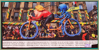 "Willkommen an Bord!" kann er dabei nur allen zurufen, die sich mit auf die Kreuzfahrt in die noch viel zu wenig ausgeforschten Gefilde einer menschengerecht gestalteten Arbeitswelt begeben. Geradezu amüsiert kann er dabei jetzt betrachten, wie die seltsamen in dieser Gruppierung FDP versammelten Typen regelrecht als aufgescheuchte Hühner durch die Gegend laufen, nicht wissend, wo vorne und hinten ist und wie man von seinen kümmerlichen Zustimmungsquote von 3% (in Worten: drei Prozent) wegzukommen vermag. Unmittelbar nach Schließung der "Wunsch-Koalition" hat er schon prognostiziert, dass man mit ihr mit Sicherheit sein blaues Wunder erleben werde, dabei sogar Blau, Gelb und Schwarz als Signalfarben der beiden sich eigentlich nur noch in die Wolle kriegenden Partner einbringend. In weiteren Einträgen hat er dazu auch noch das Parteikürzel in der Form ausgedeutet, die diesem seltsamen Haufen wie auf den Leib geschnitten erscheint: "Füll Dein Portemonnaie!"